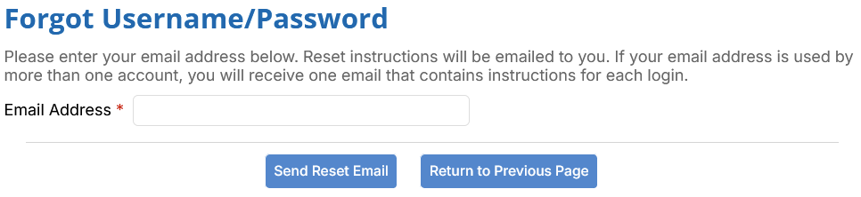 An email will be sent to that address with instructions and a links to set a new username and/or password. The link provided in the email will remain active for 20 minutes. If that time expires, you will have to restart the password reset process.