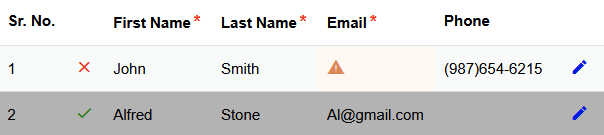 Any records missing required information will have an X in the first column and an alert icon indicating the missing information.