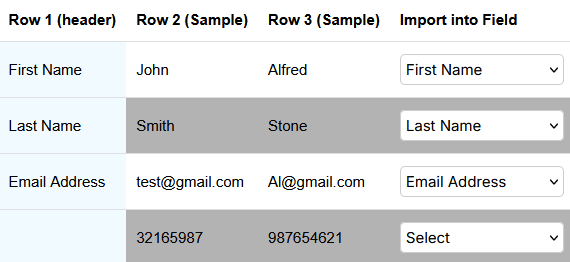Each column of your document will be represented along with a sample of the data from your import document. Use the Import into Field column to identify the data in your import document's columns. If your document included a header row, you should simply match Row 1 (header) with your Import into Field.
