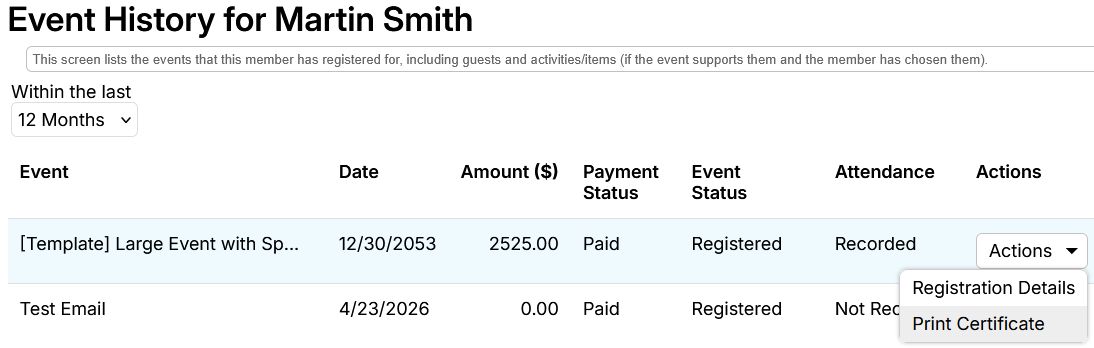 After an event registrant is marked as attending the event, they will be able to download the automatically generated certificate form their member profile, in the Event History section.