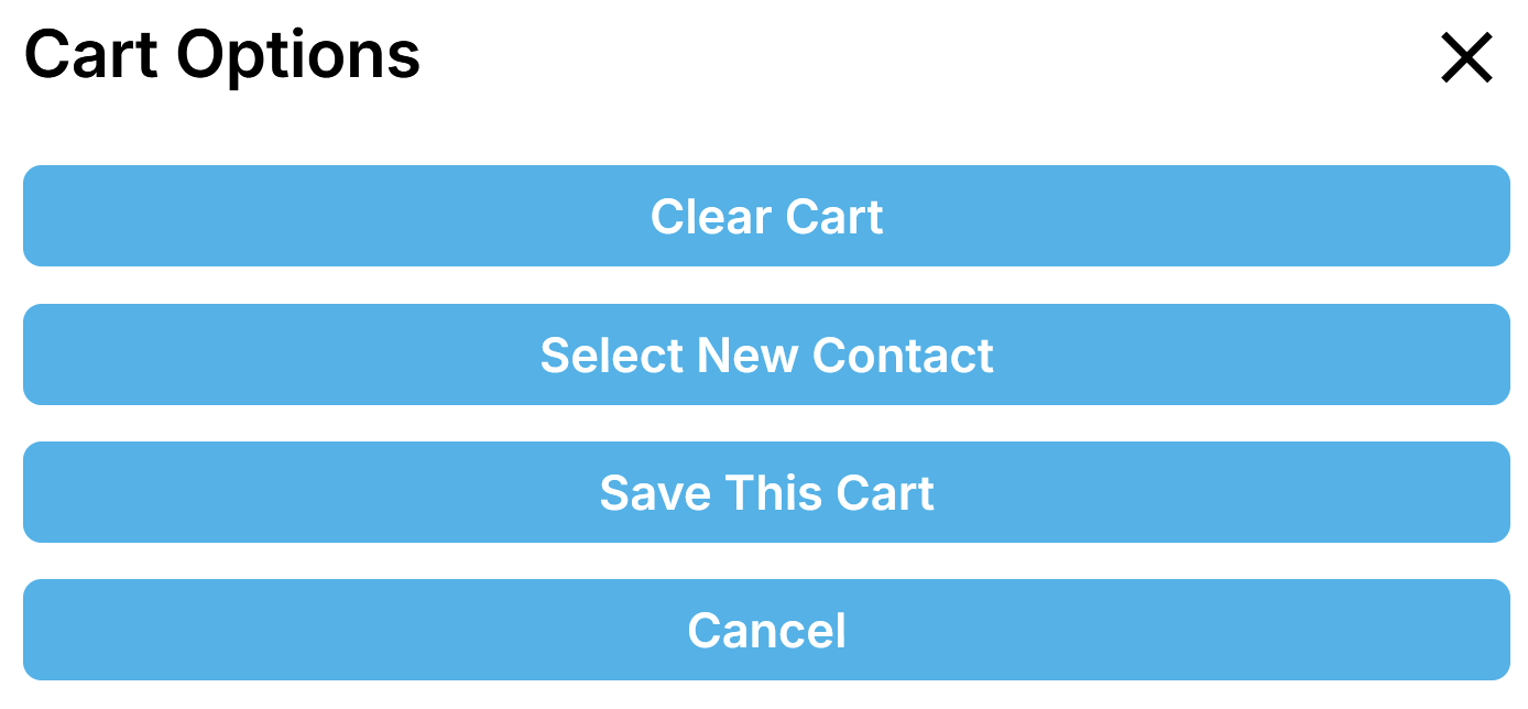 Once a contact as been selected and items have been added to the cart, you may select the options icon next to the checkout icon and select one of the available options.