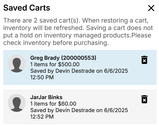 Selecting a saved cart and clicking the Restore button will allow you to pick up where you left off on a previous cart.