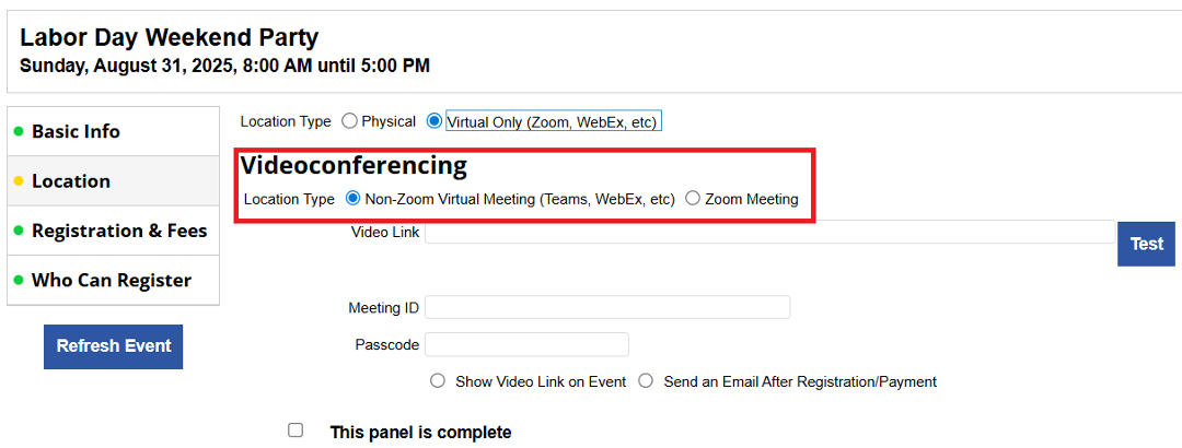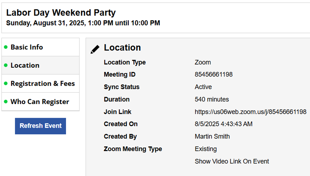 To integrate a Zoom meeting into an event (not simply including a zoom link in the location) you must first connect ClubExpress to an active Zoom account. Learn more here.