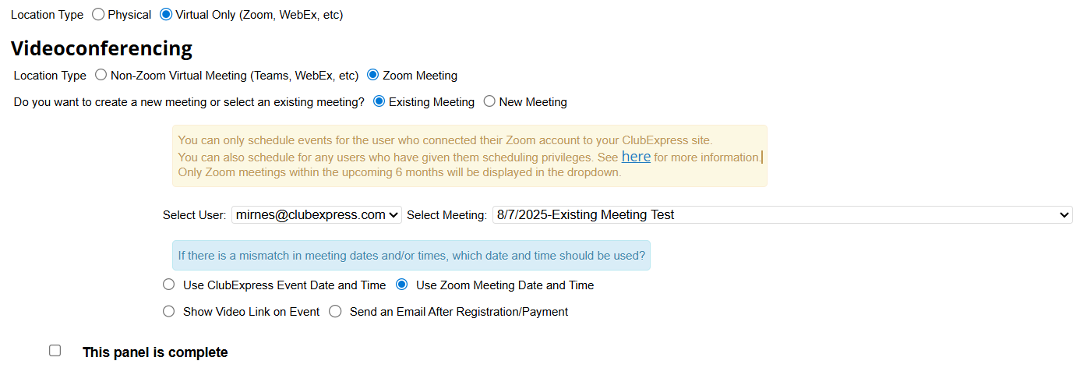 If there is a mismatch in date, time, or timezone between your ClubExpress event and the existing Zoom meeting, you can select if the ClubExpress event will change to match the Zoom meeting, or vice versa. Selecting one option will alter the set time of the ClubExpress/Zoom event.