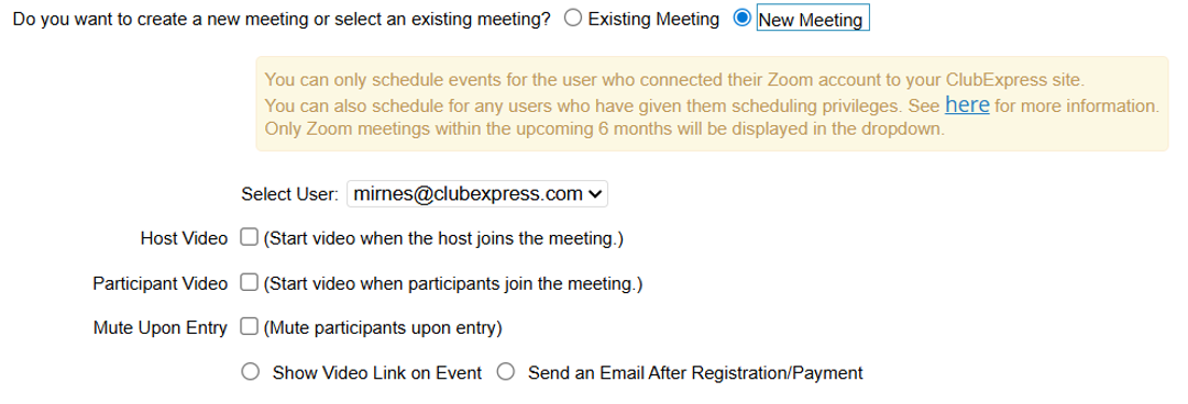 Select the Zoom Meeting option. You will see the option for connecting to an existing meeting or to create a new meeting from your event information. You will also see a Zoom User dropdown where you can select which account to use for the Zoom meeting. If the Zoom account connected to your site has scheduling privileges for other users, you will see both the connected account and the other users in the Zoom Users drop-down.