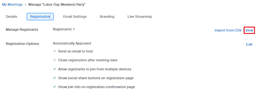 When a user registers for your event, they will also automatically be registered on Zoom. You can view the users registered on the Zoom meeting by going to your Zoom account, navigating to your upcoming meetings, click on the connected meeting, going to the Registration tab and clicking on the “view” button: