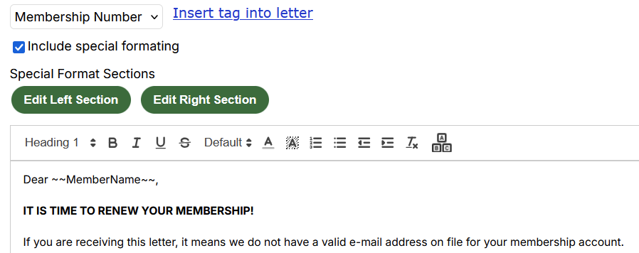 The Insert Tag option allows your to include additional member information in your template by selecting the information you want to include, using your cursor to select the location you would like the information included, and then clicking the Insert tag into letter link. Any member information will appear with ~~tildes~~ around it and will be replaced with the associated members information when the letters are generated.