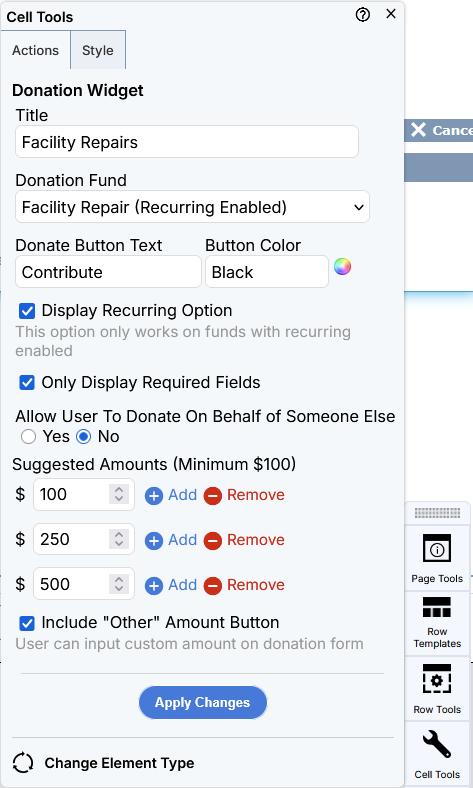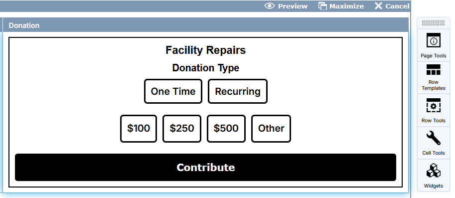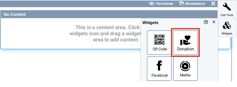 Once your widget has been added to a cell, use the Cell Tools to configure your donation settings.